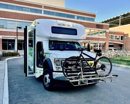 All Grid shuttles have front-mounted bike racks. Download our step-by-step directions so you can confidently load and unload. Riders are responsible for securing and removing their own bikes.