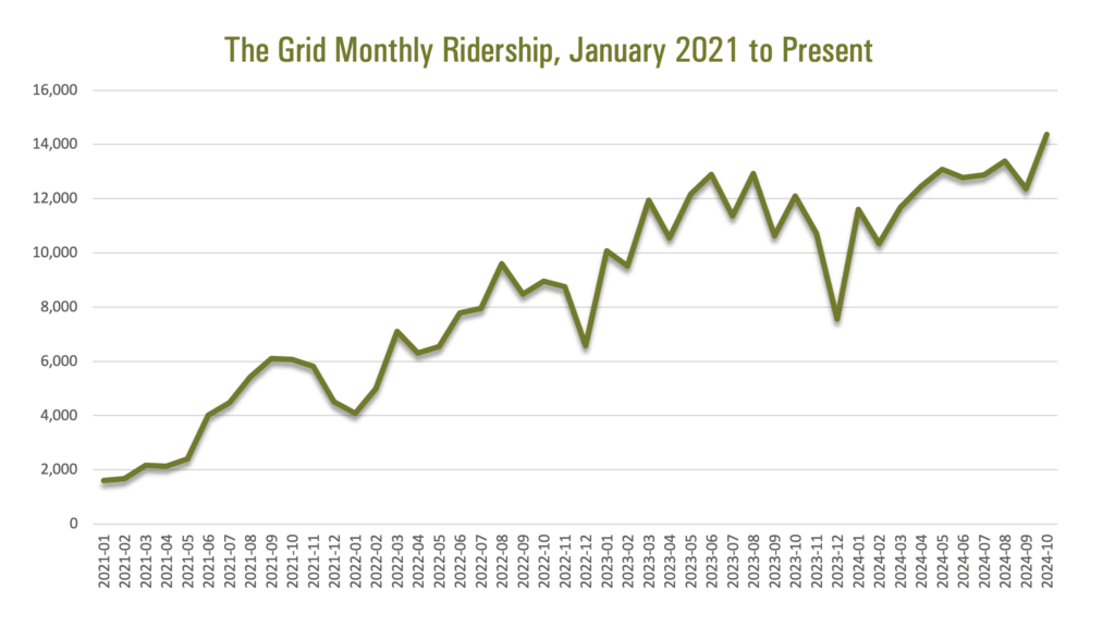 Balancing the needs of our many members, stops, and routes requires continuous logistical finesse, but the effort is undeniably effective: In October 2024 alone, The Grid provided 14,375 rides, which represents a 19% increase over October 2023, a 61% increase over October 2022, and a 137% increase over October 2021. On most routes, we currently carry more riders per revenue service hour than we carried in 2019. Our 12-month total (November 2023-October 2024) is 143,230 rides, and we intend to drive toward higher numbers in 2025!