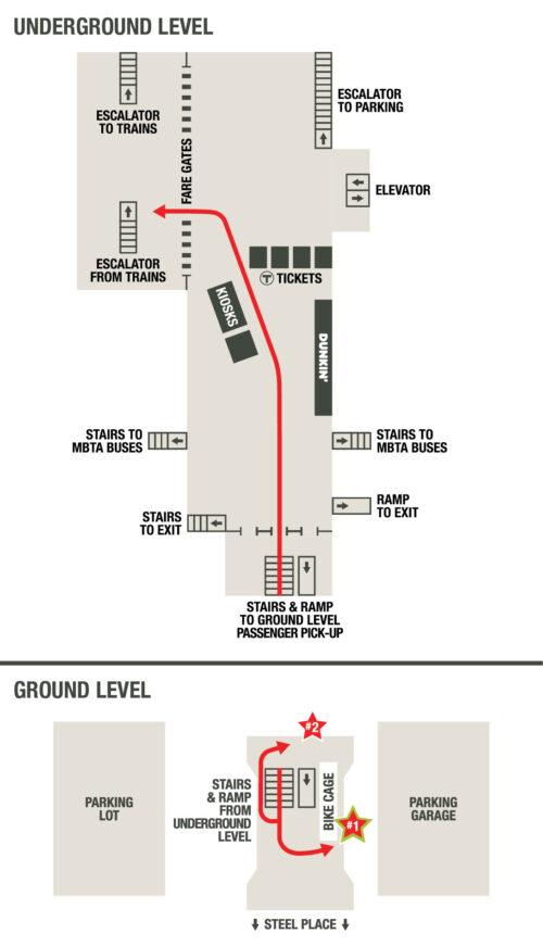 - After passing the fare gates, bear slightly right toward Drop-Off/Pick-Up, Cambridgepark Dr. Do not go to the Busway via the yellow stairs/escalators.